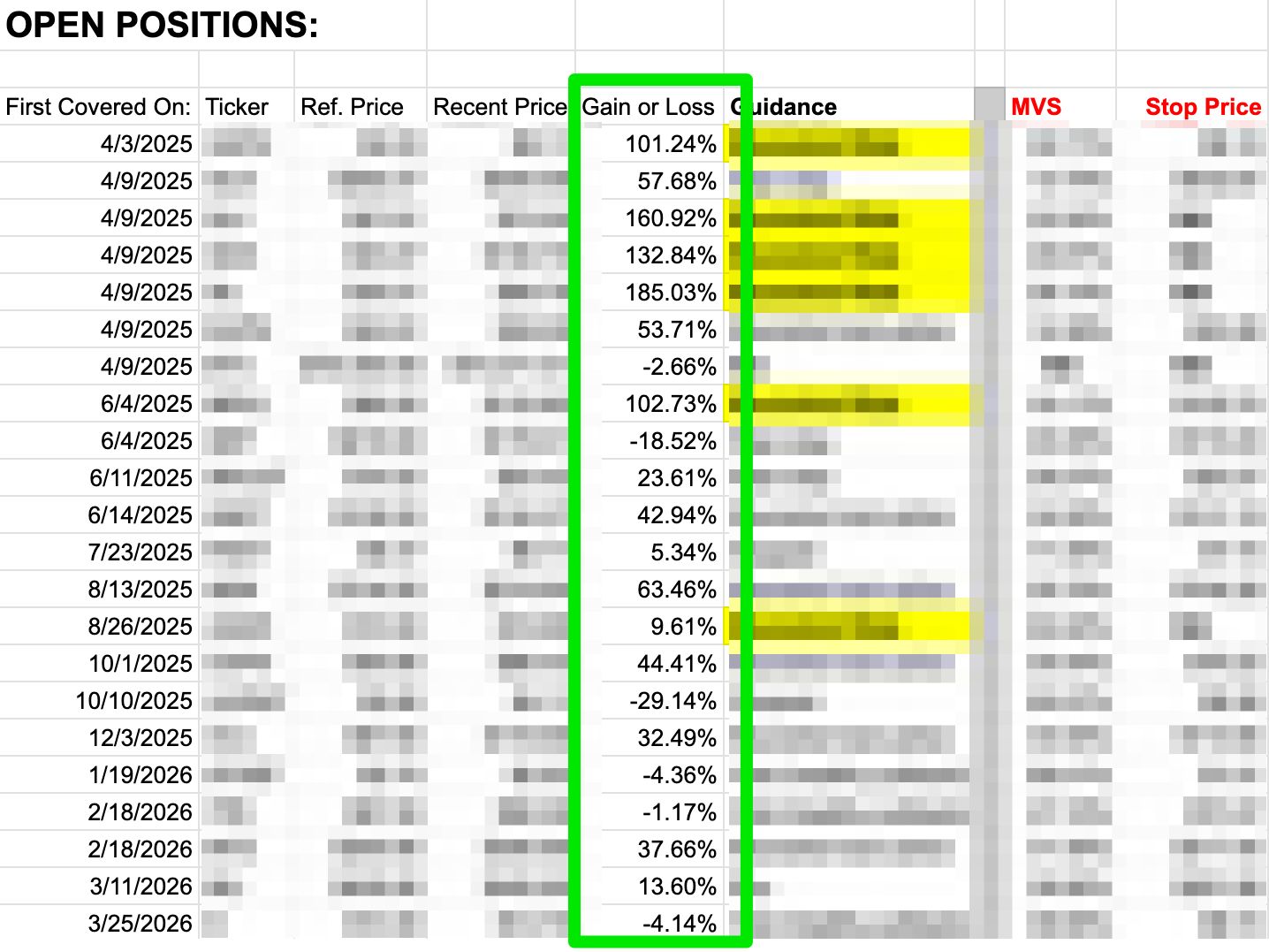 P.S. Here’s a screenshot of the current Moonshot Minute Portfolio. I’ve blurred out the tickers since that information is only for Premium Members, but you can see how we’ve done so far: